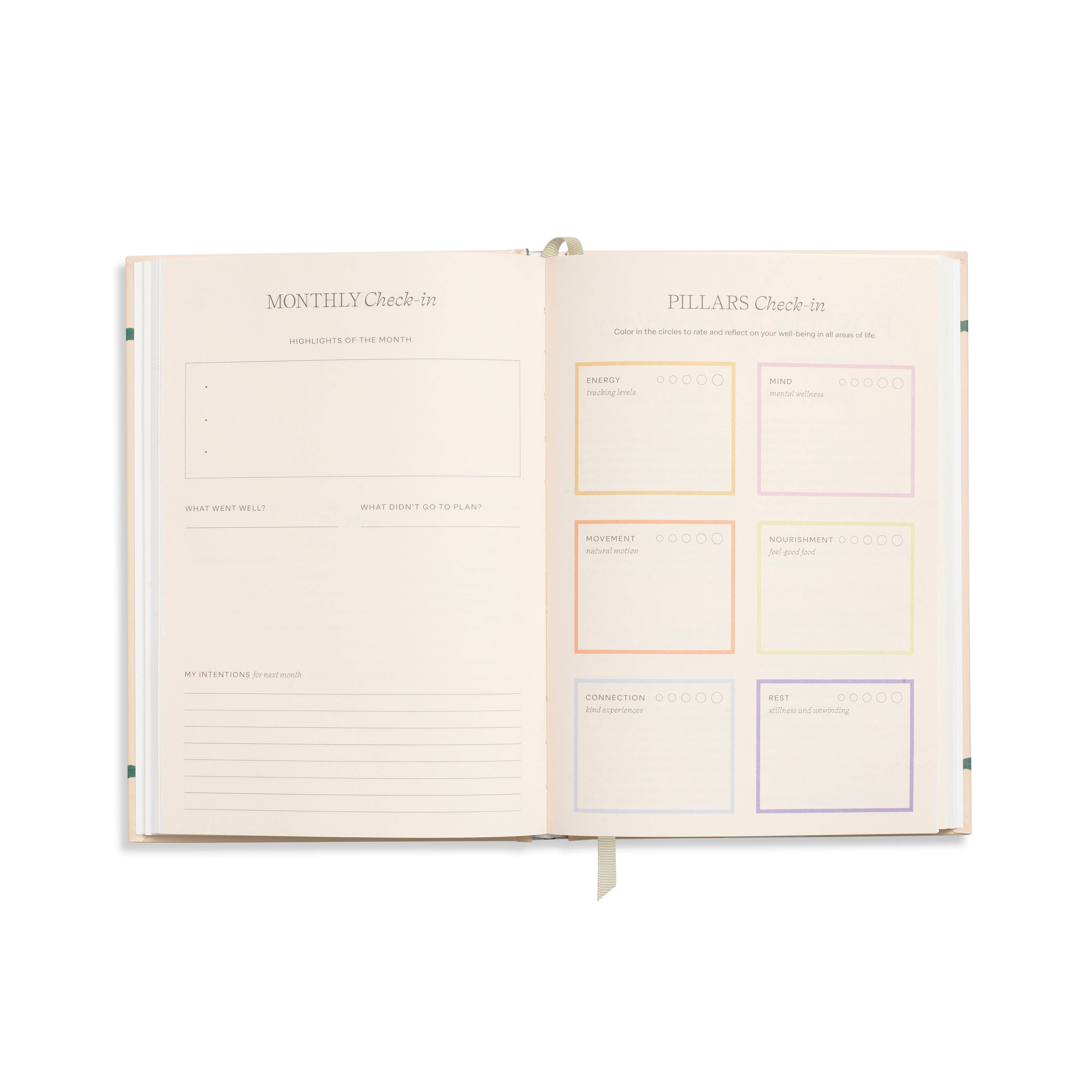 - 12 weeks worth of daily overview pages (two-page spread for each day), with space for logging intentions, sleep and energy levels in the morning and evening