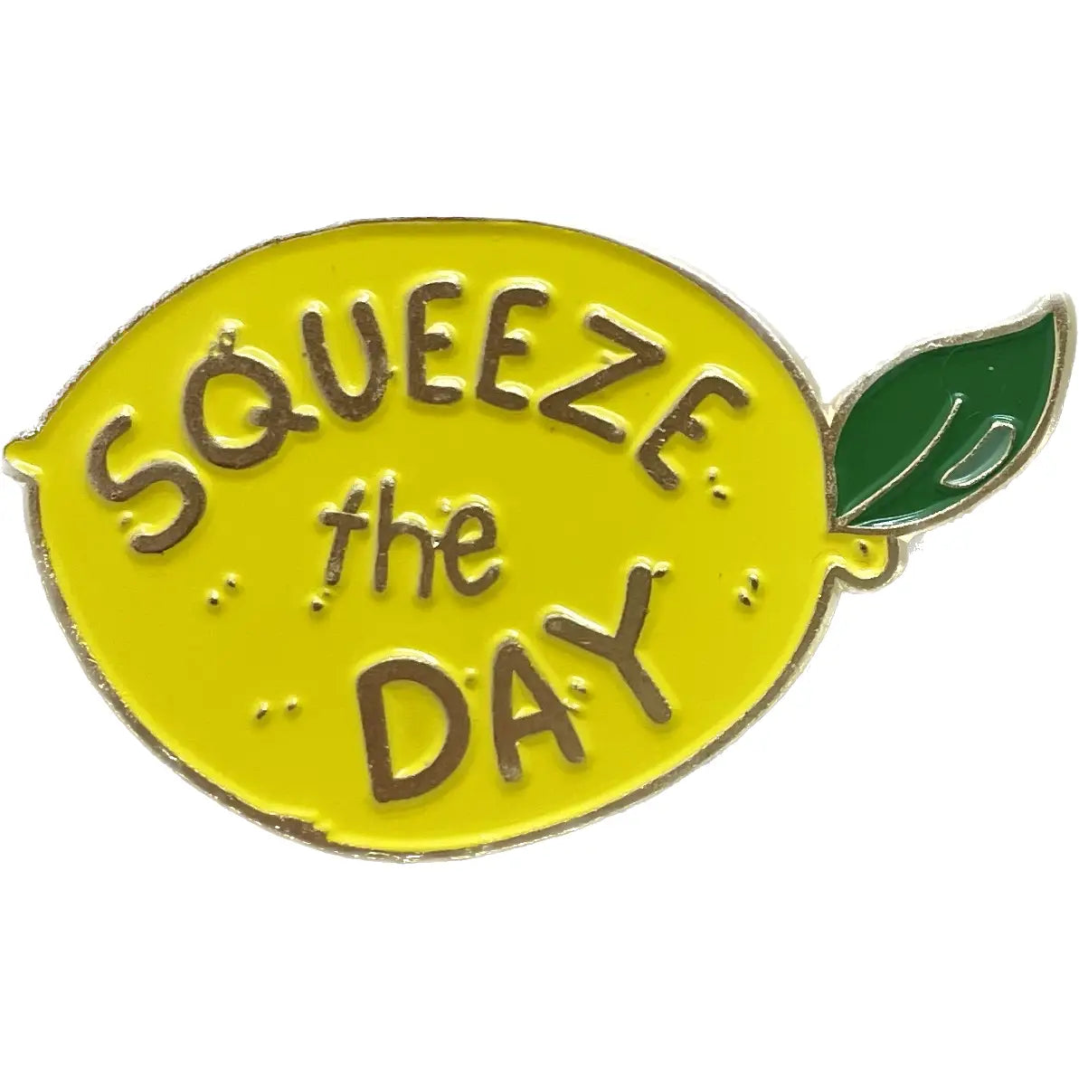 * high quality enamel pin * lemon shaped with “squeeze the day” on it * colors - yellow, green and gold * Bee Unique logo on back * size: 1.5” wide x 1” high