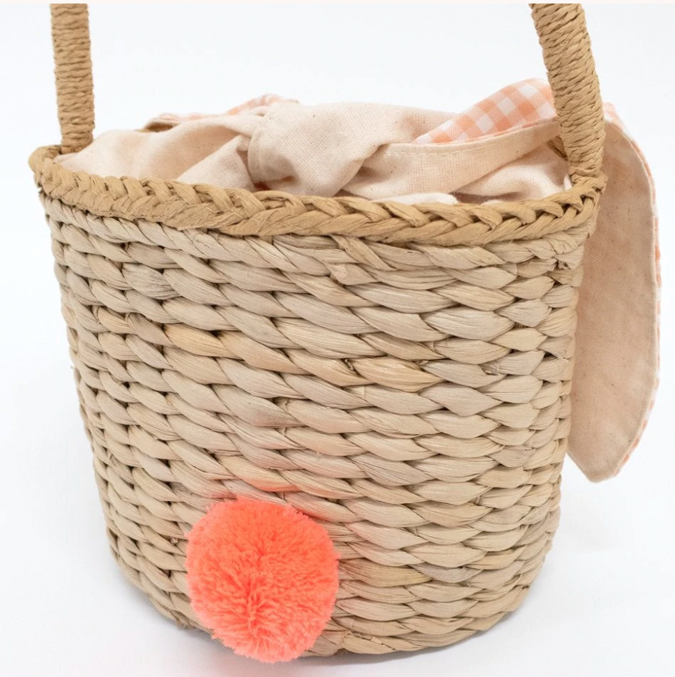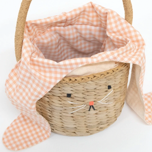 This gorgeous straw bag has a sweet bunny face, a peach gingham cotton lining, fun floppy ears and a cute pompom tail. It is perfect as an Easter basket, or for any special occasion where an adorable accessory will add style.
