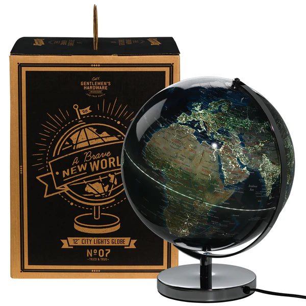 Plug in this 12" globe, give it a whirl and marvel at the world’s nighttime city lights. Comes with a sturdy stainless steel base and is smartly packaged in a presentation box bearing the words 'A Brave New World'. Size: 420 x 310 x 310mm.Less