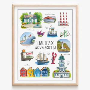 Print of original paintings by Janna Wilton Art. This design depicts some of my favorite things in Halifax, Nova Scotia! Illustrations are as follows: