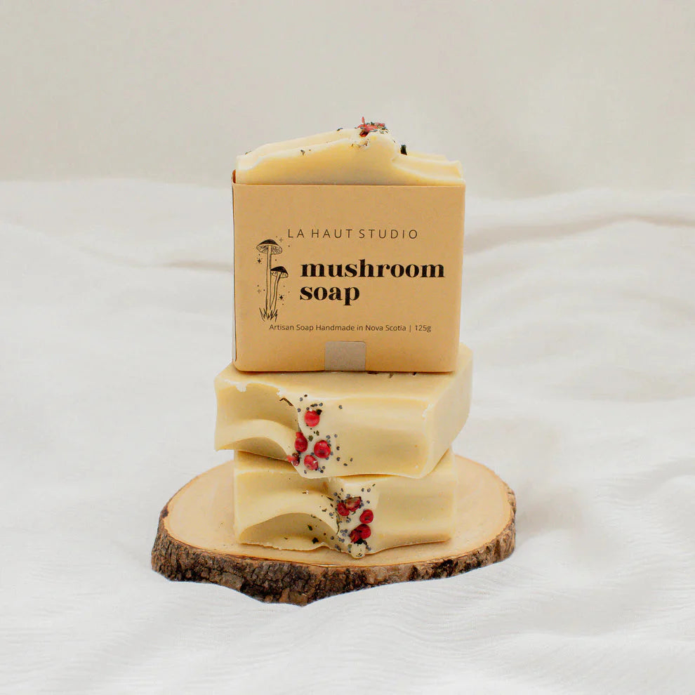 This bar is infused with reishi mushrooms which are anti inflammatory as well as an excellent solution for hydrating the skin, fading dark marks, and improving scars. Packed with skin loving oils like, olive oil, shea butter, coconut oil, almond oil and caster oil. Scented with cedarwood, patchouli and bergamot. Topped with poppyseeds and peppercorns.