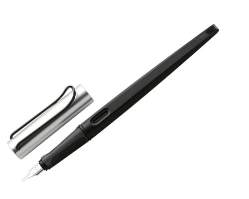 Easy to hold due to distinctive recessed grips. With spring-loaded bronze wire clip. Sturdy plastic, shiny black; steel nib with 1.5mm chisel point; with ink cartridge LAMY T 10 blue; can be used with the converter LAMY Z 28.