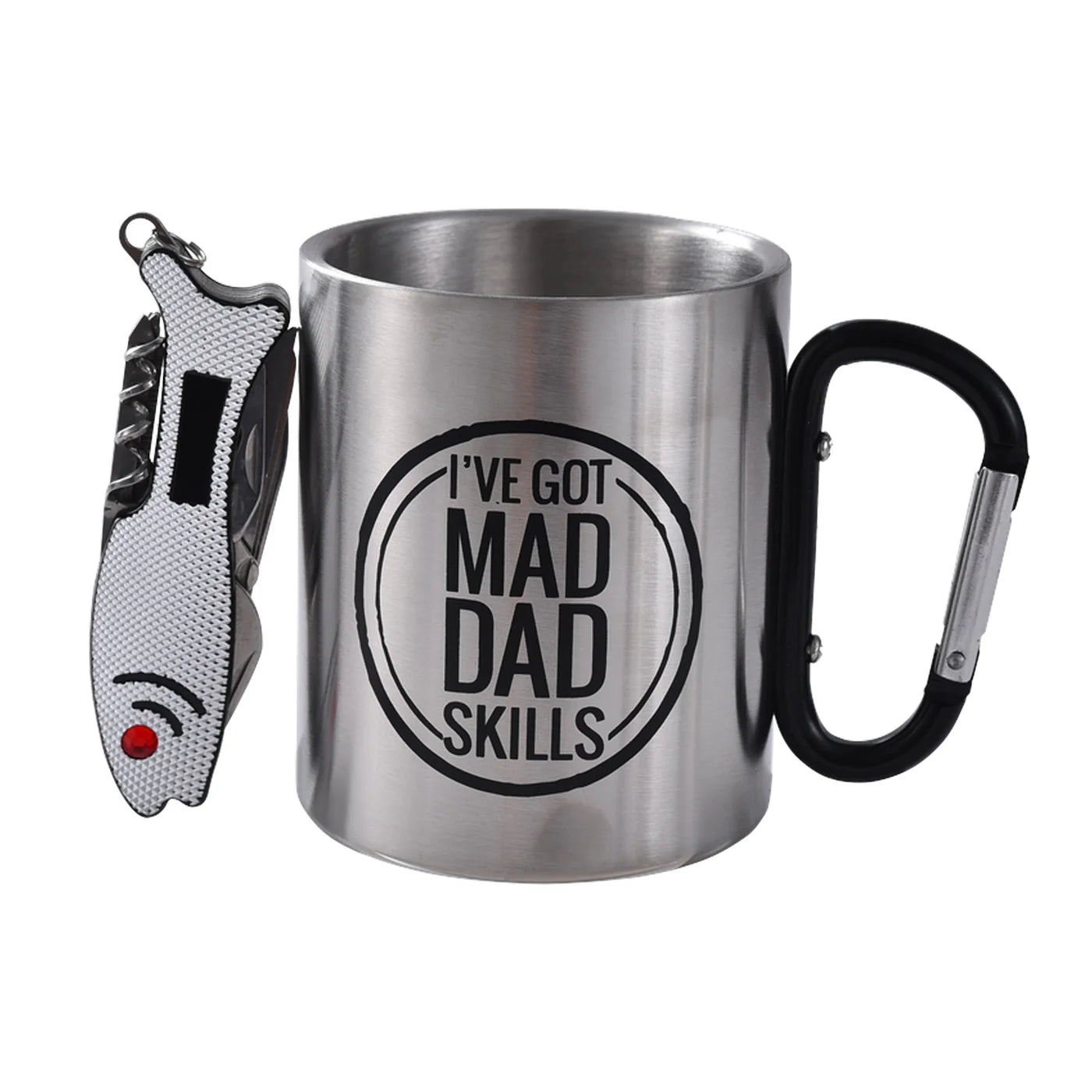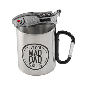 Adventure awaits! Stainless steel mug with carabiner handle. Includes the Fisherman’s Friend multi-tool: bottle opener, corkscrew, Phillips head screwdriver & knife.