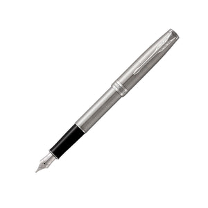 Bright brushed steel, complemented with chrome trim, glossy black grip section, and a stainless steel nib.